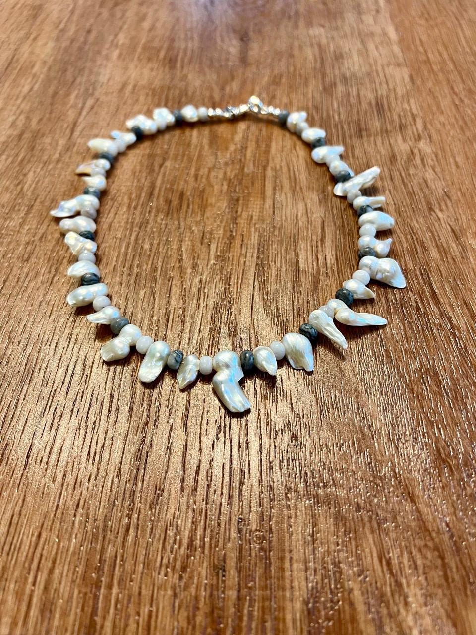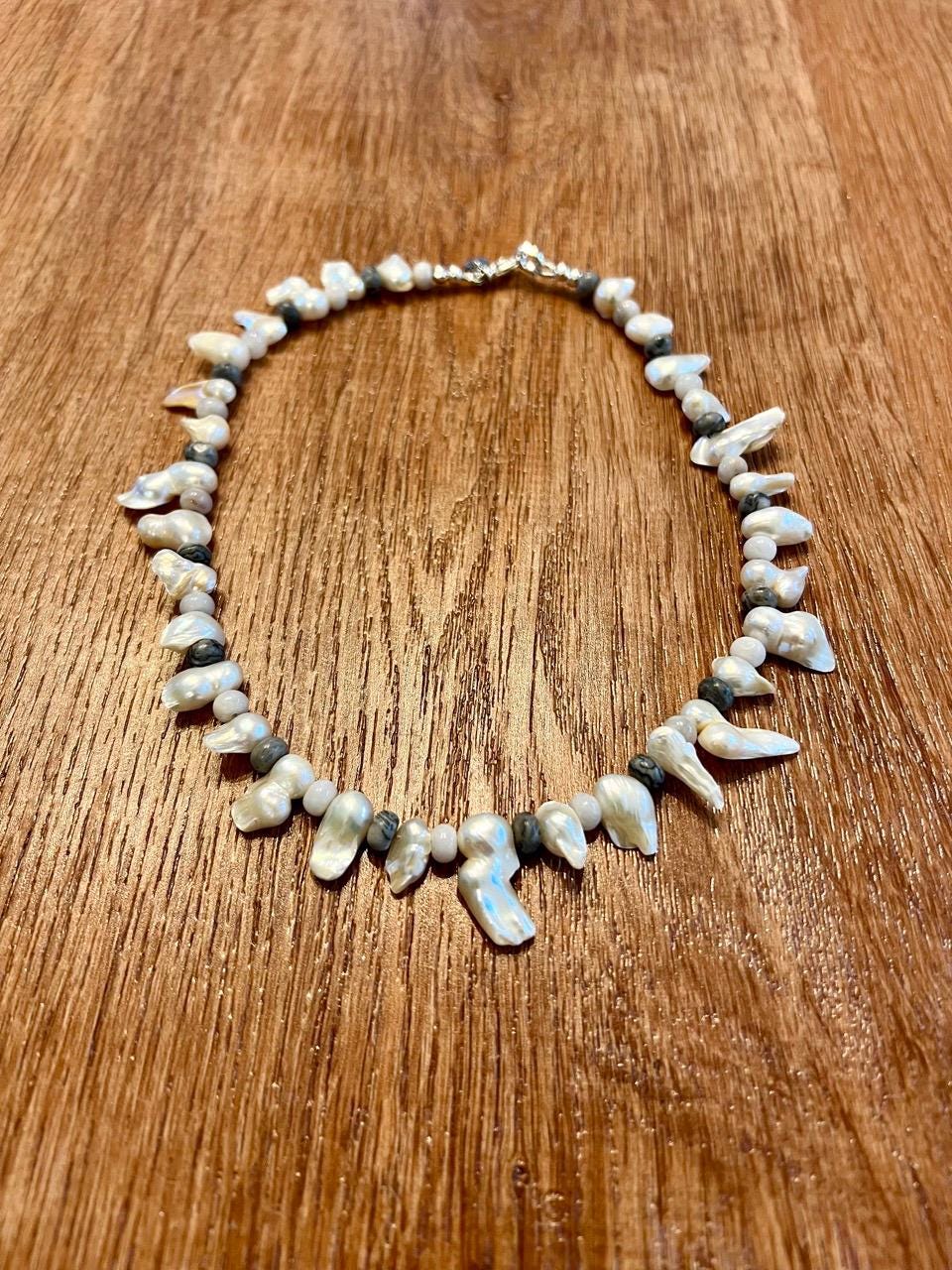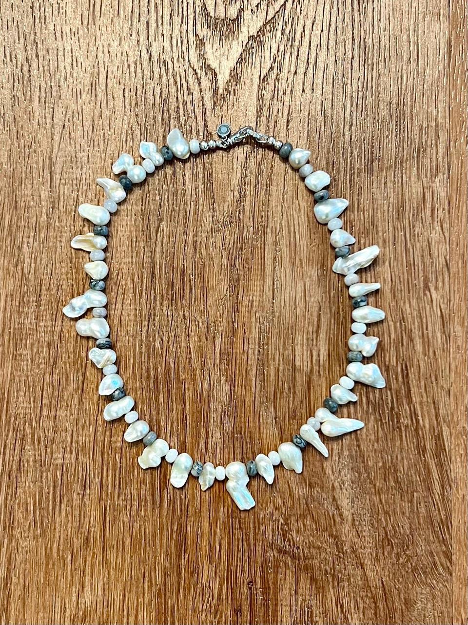 Biwa Pearls, White Crazy Lace Agate and Silver Crazy Lace Agate make up this choker necklace, right in line with the Fall trends and a fashion-forward take on the traditional pearl necklace. Finished with a silver plated lobster claw clasp, measures 16"