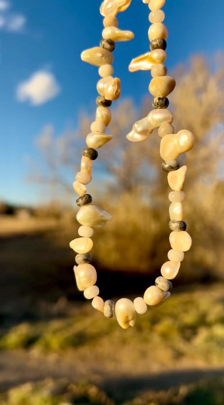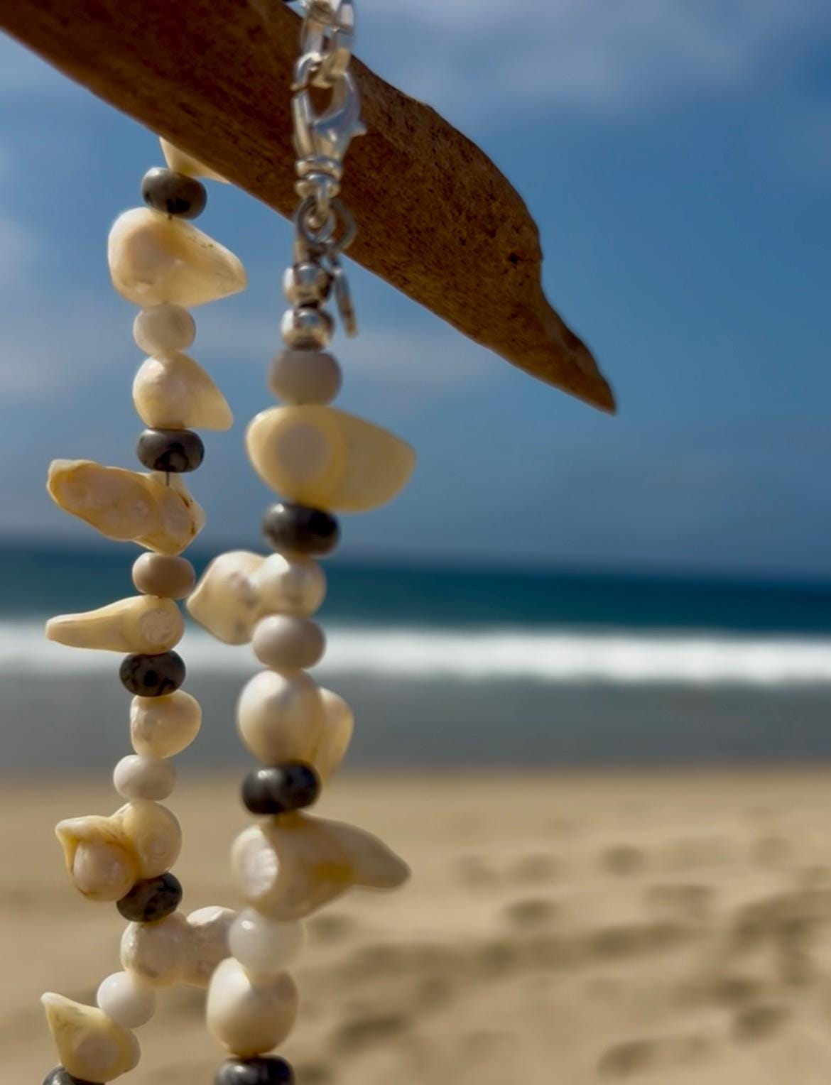 All jewelry is handmade of natural materials, by me, by the beach in California or by the mountains in Colorado or wherever I happen to be traveling. Packaging is compostable or recycled and/or recyclable. Items are shipped in an organic cotton jewelry bag, with a care card, in a gift box with raffia ribbon and wood beads, ready for gifting to yourself or another.