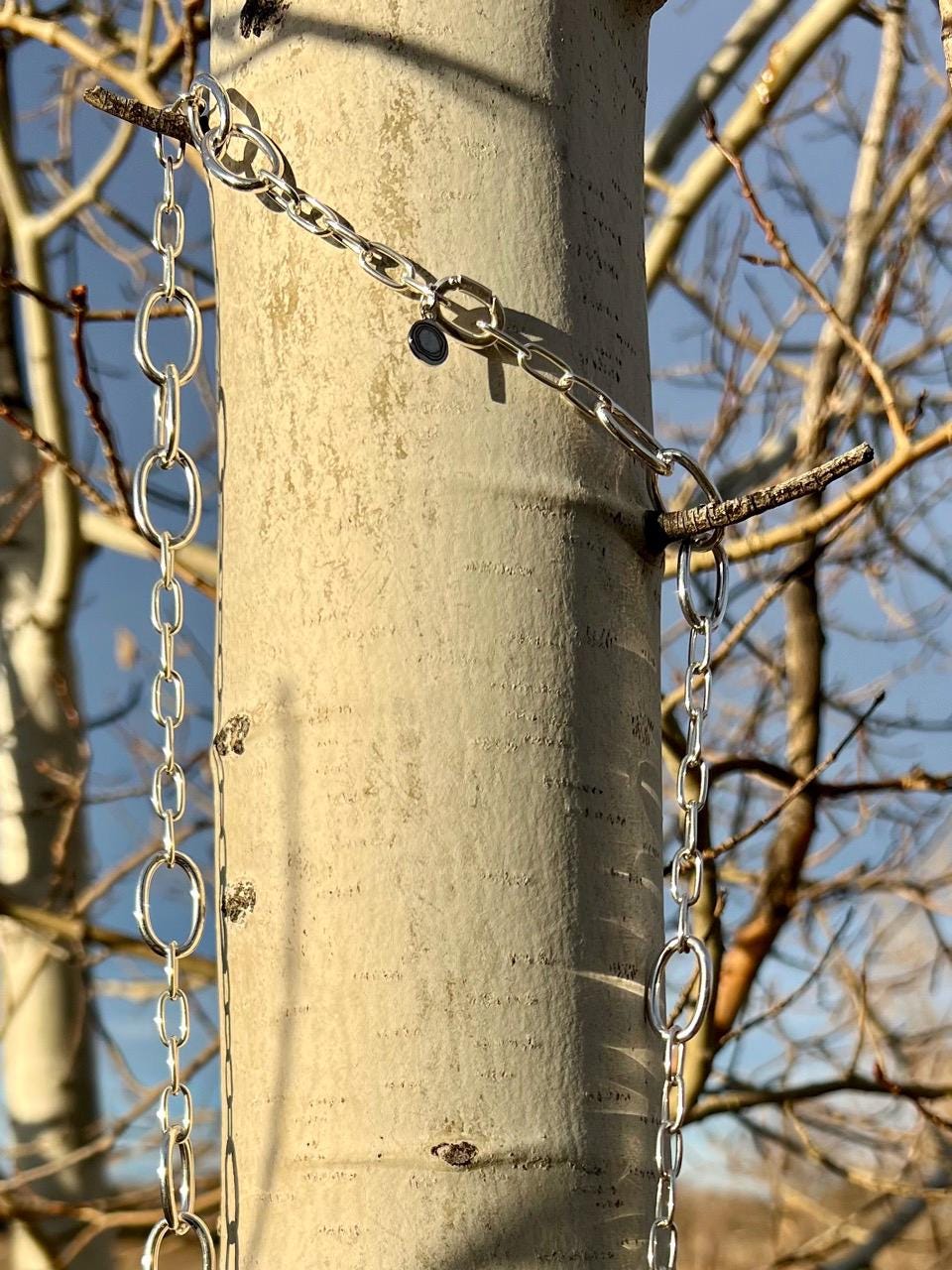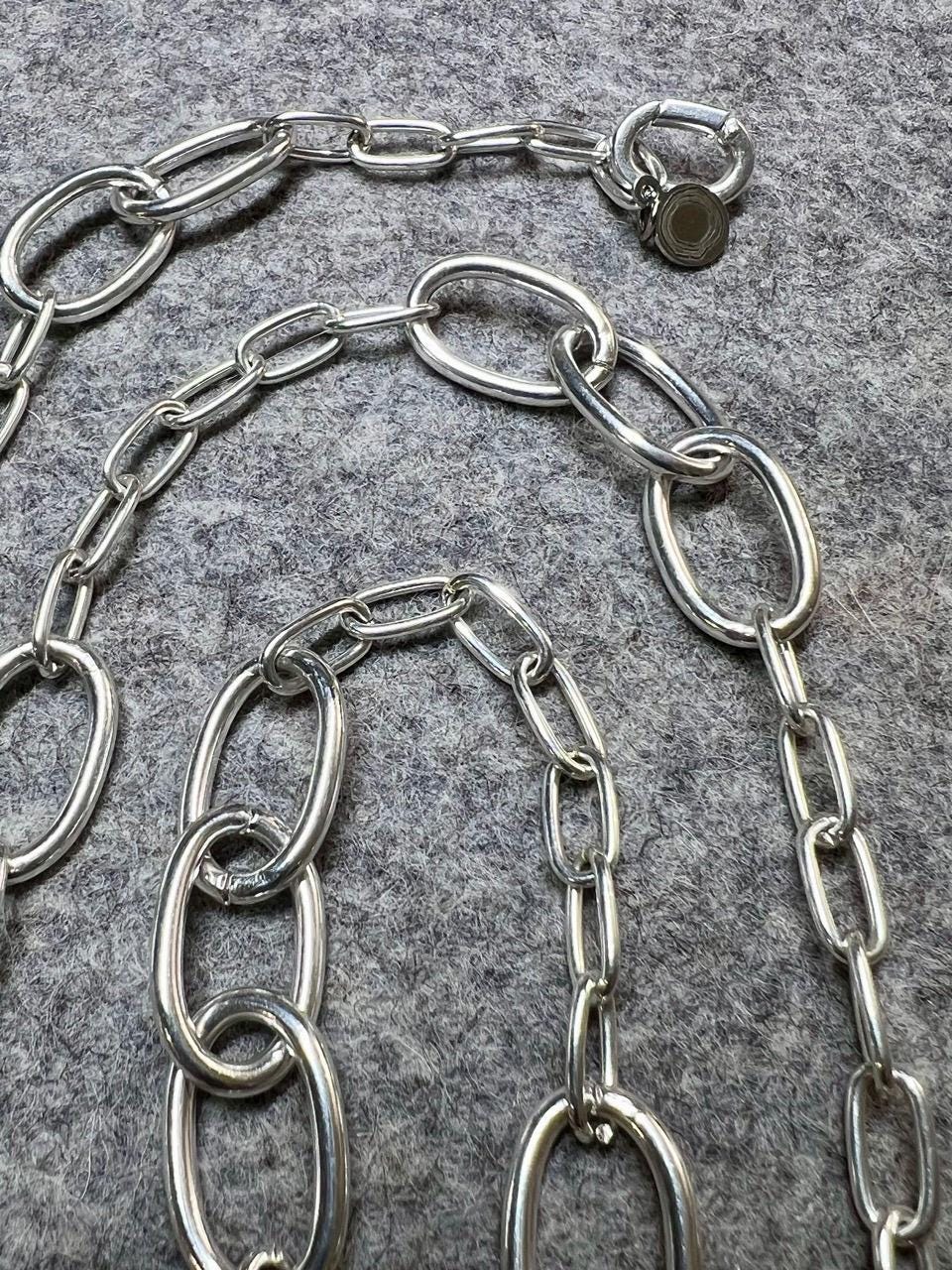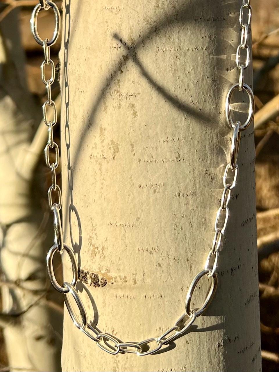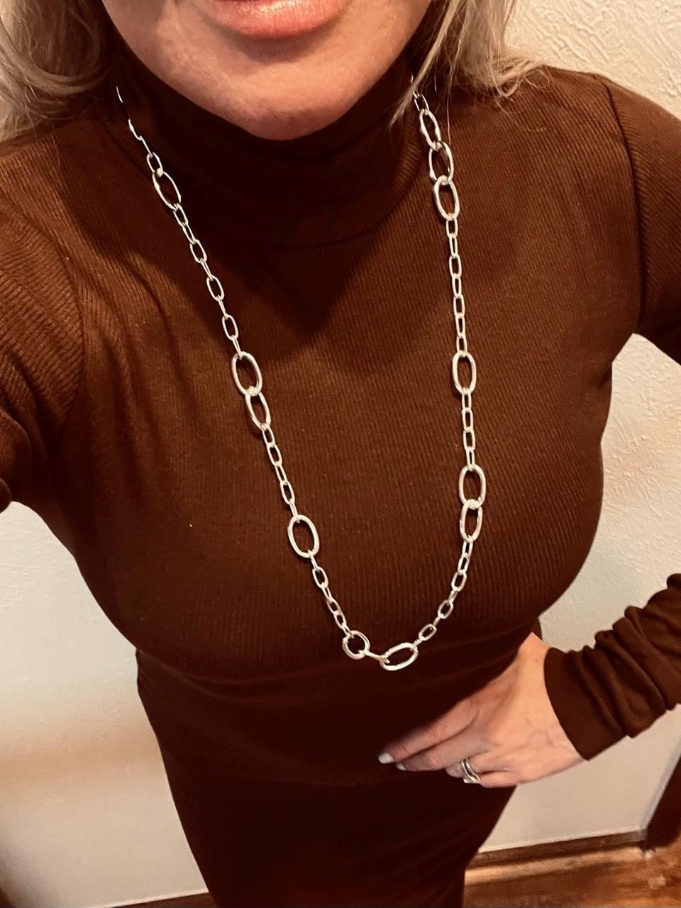Handmade, silver plated necklace mixes two sizes of chains to create a unique, long 32" strand. This necklace makes a great gift because it works for Holidays, Winter, Spring, Summer, Fall, dressy, casual or in between. The hinge clasp can attach to any 2 links of the smaller chain, allowing it to be worn in several configurations - as a single long strand, doubled as a choker, or as a long pendant necklace.