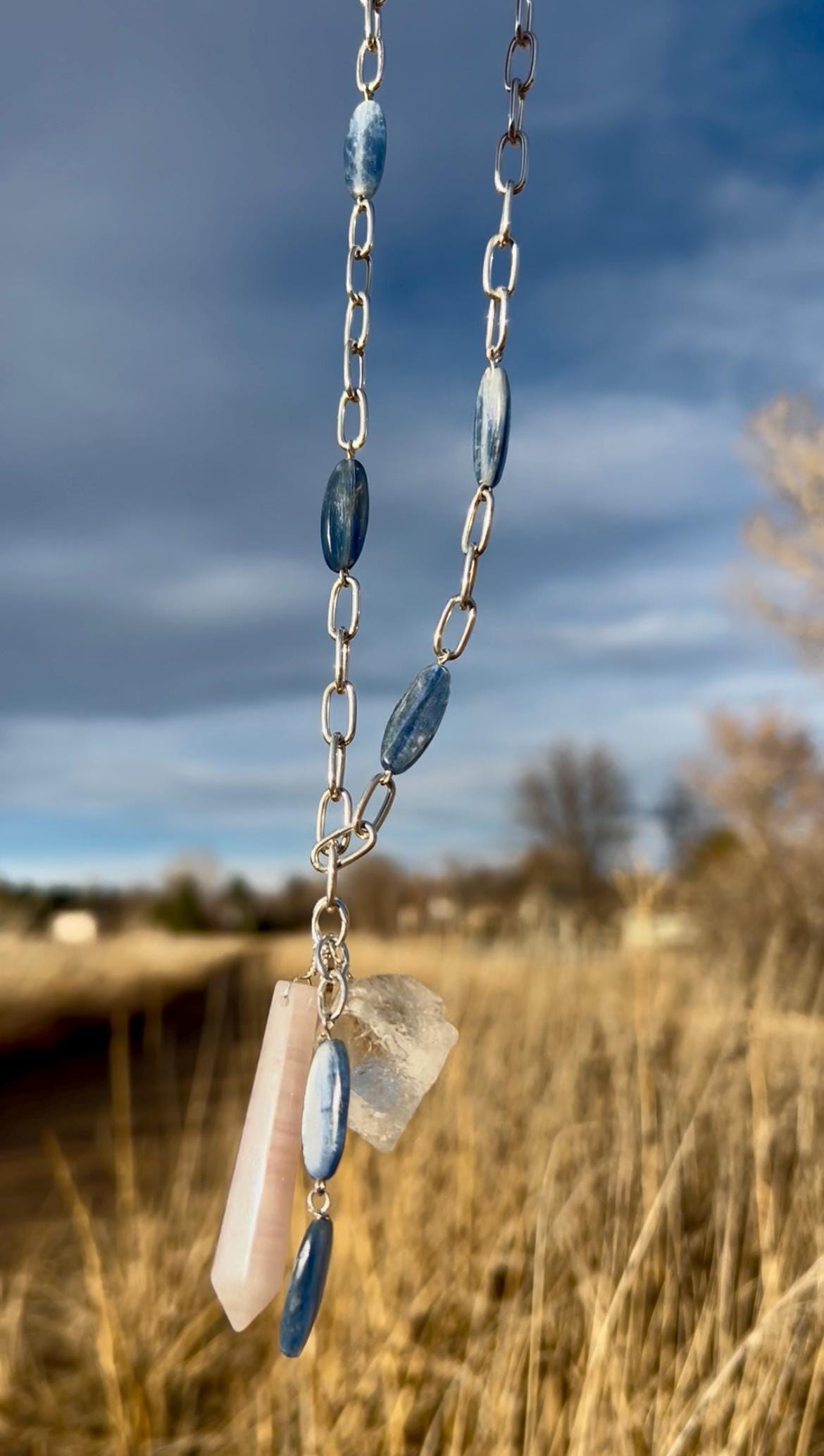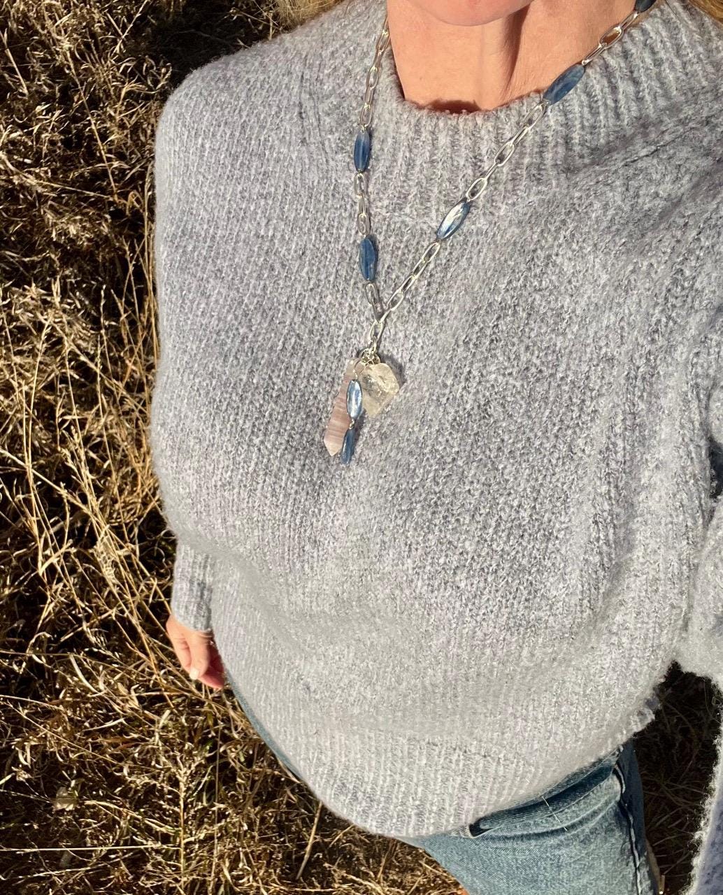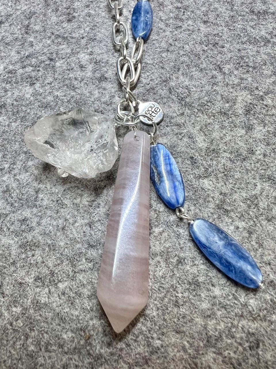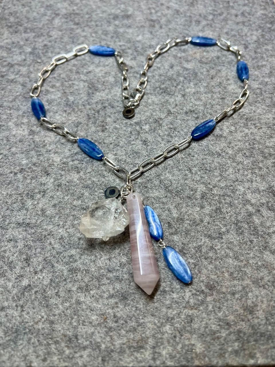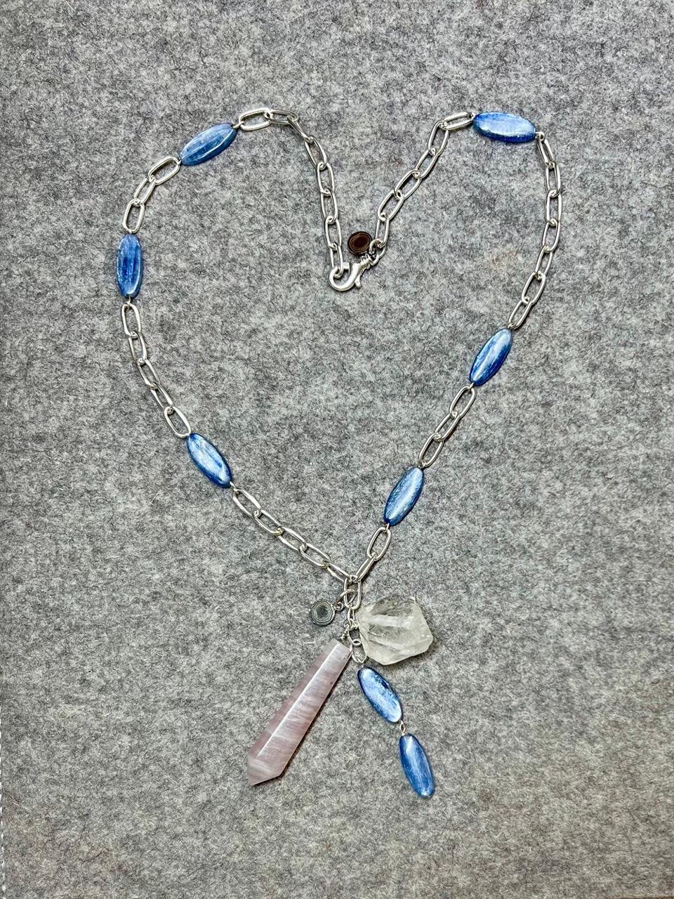 This unique pendant necklace features a charm pendant with Kyanite, Clear Quartz and Rose Quartz. The chain it hangs from features beads of Kyanite. The Kyanite is a beautiful steely blue color shot through with strands of silver so that it changes with the light. It reminds me of a medium faded denim color, and I'd say the outdoor images are a closer representation of the color than the images on the indoor. The necklace is 20.5" inches and the pendant is an additional 2.5".