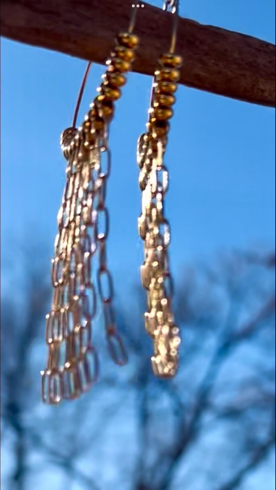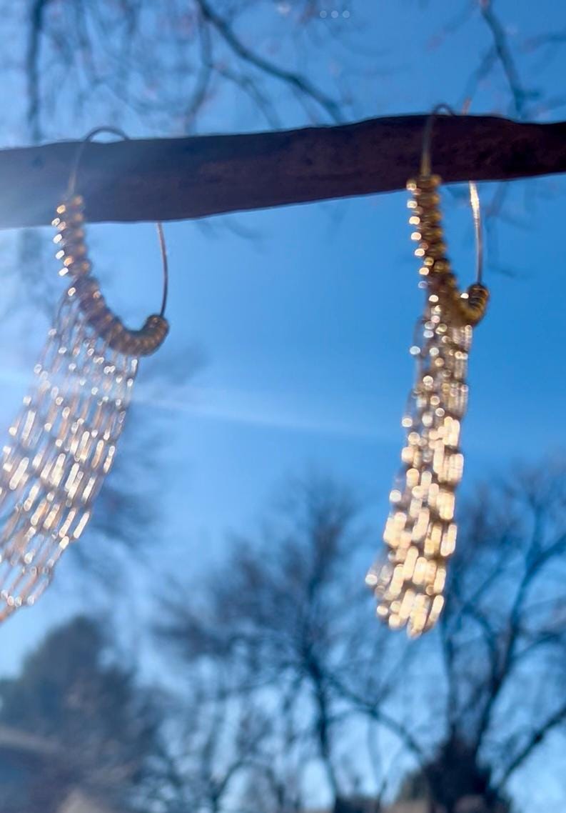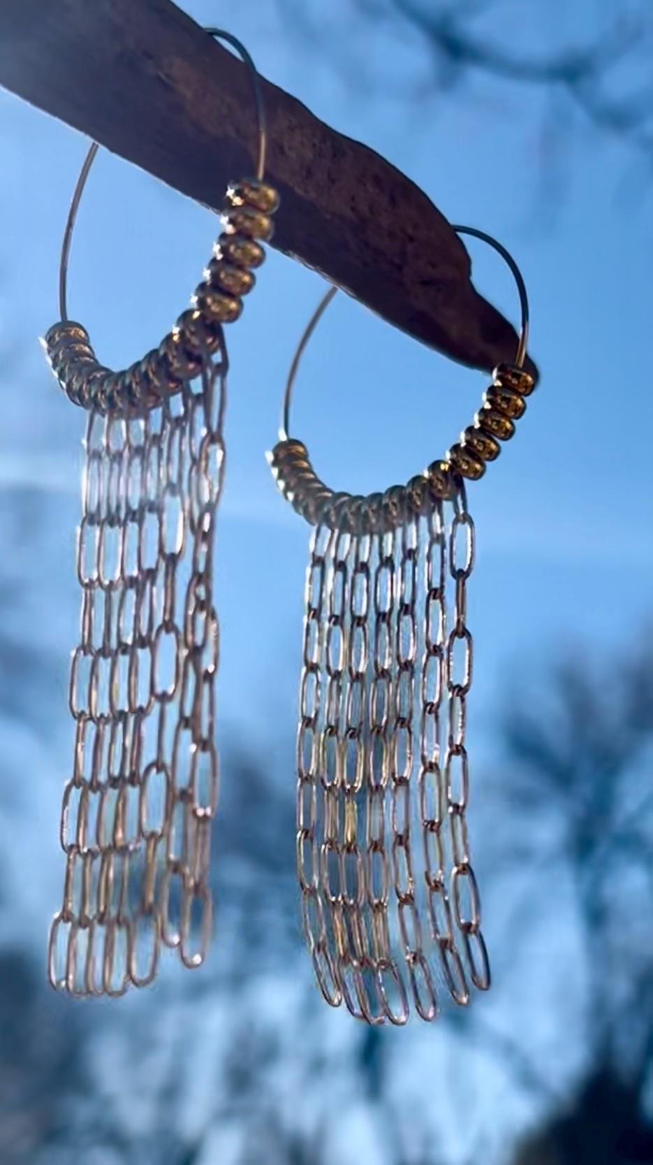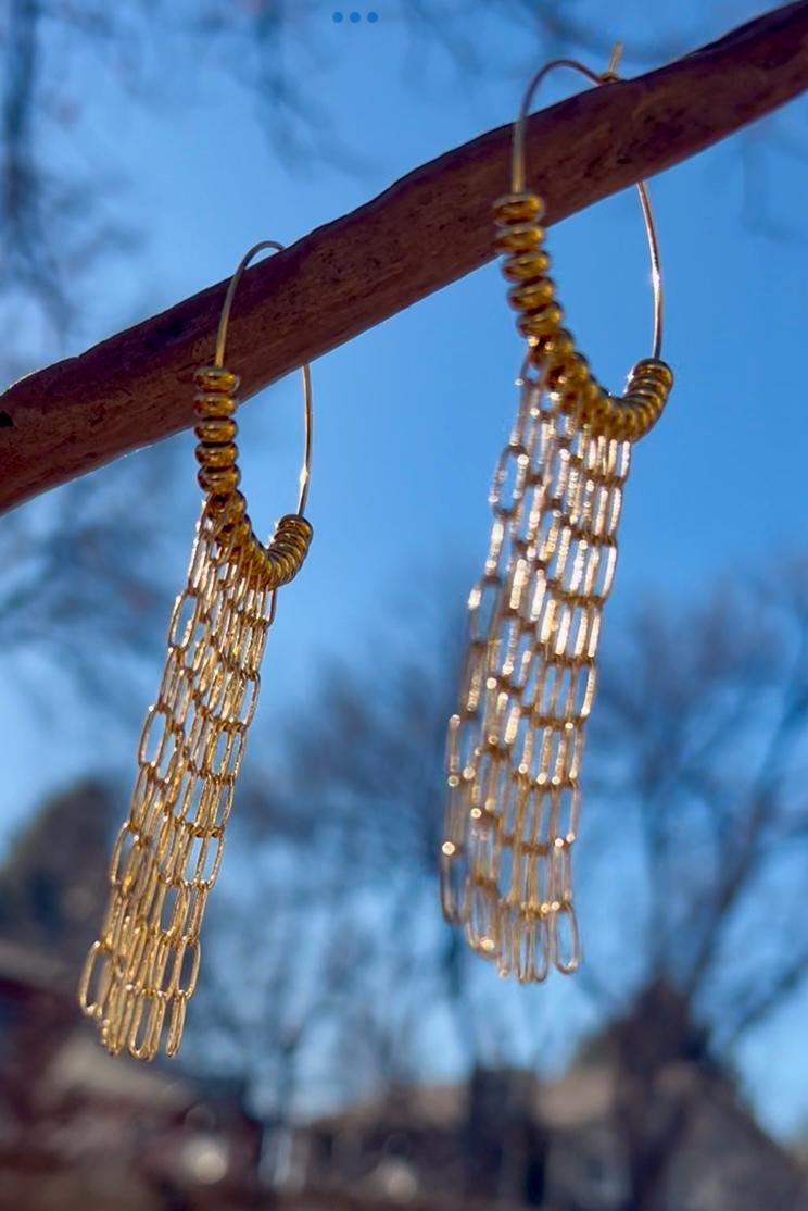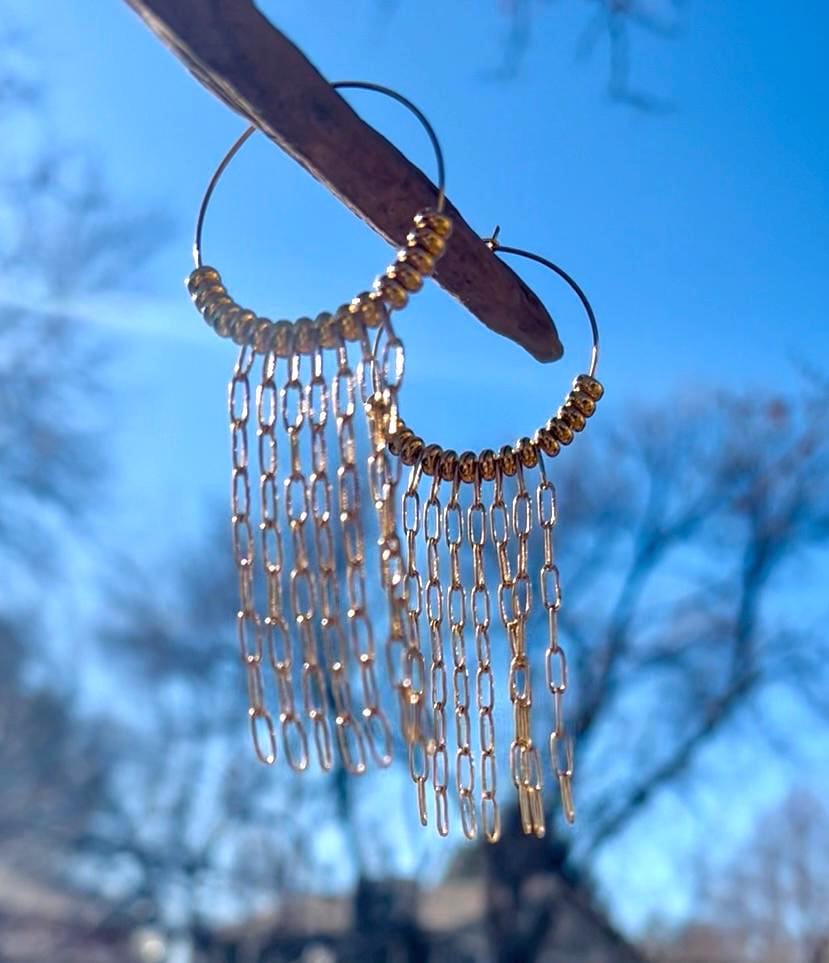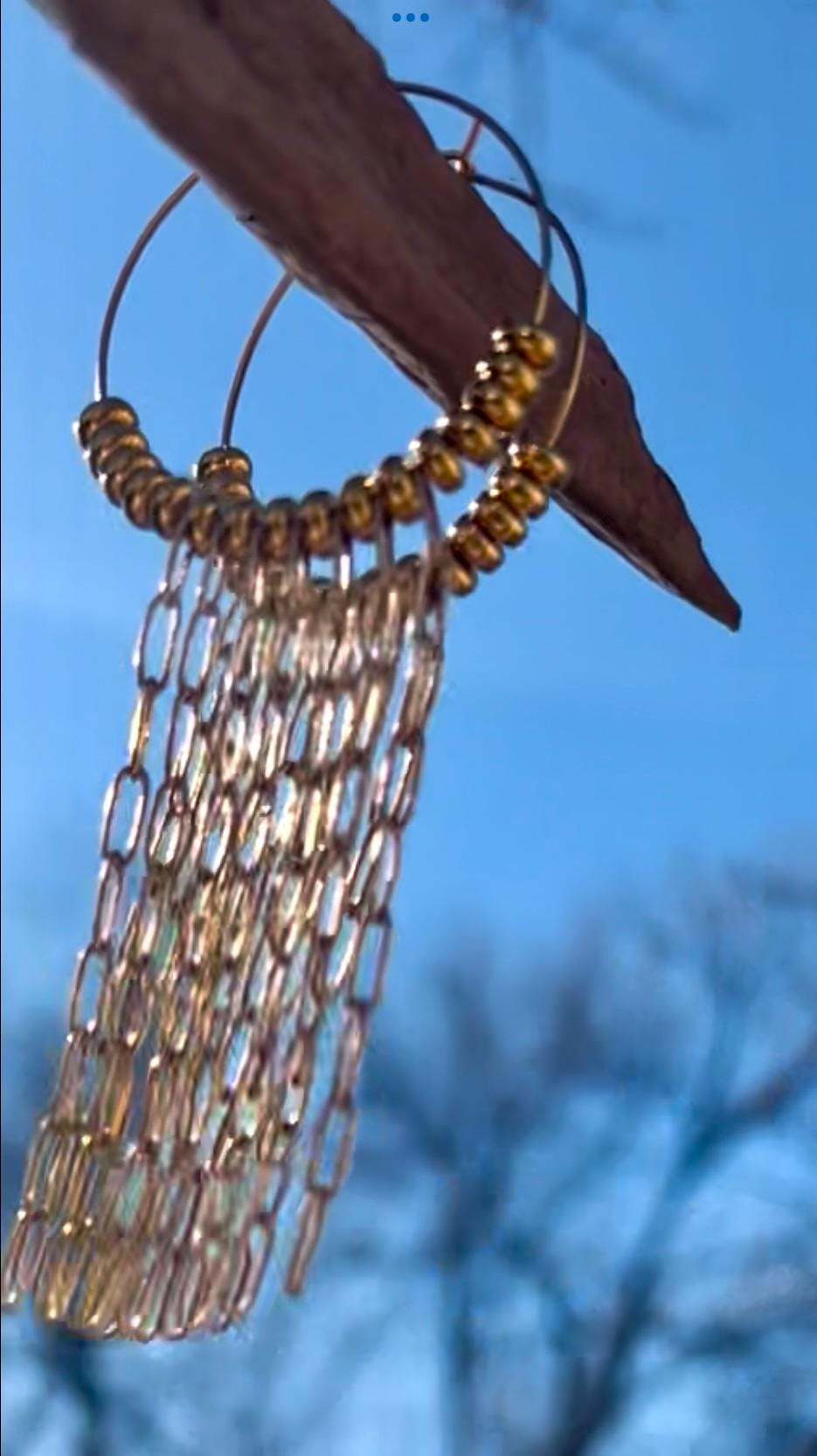 Lightweight comfortable earrings with a lot of impact. These catch the light beautifully as they move, with the delicate gold chains. The monochrome gold components make for a clean design while still providing a lot of glamour. Total length is approximately 3.75" and the hoops are about 1.25" diameter.