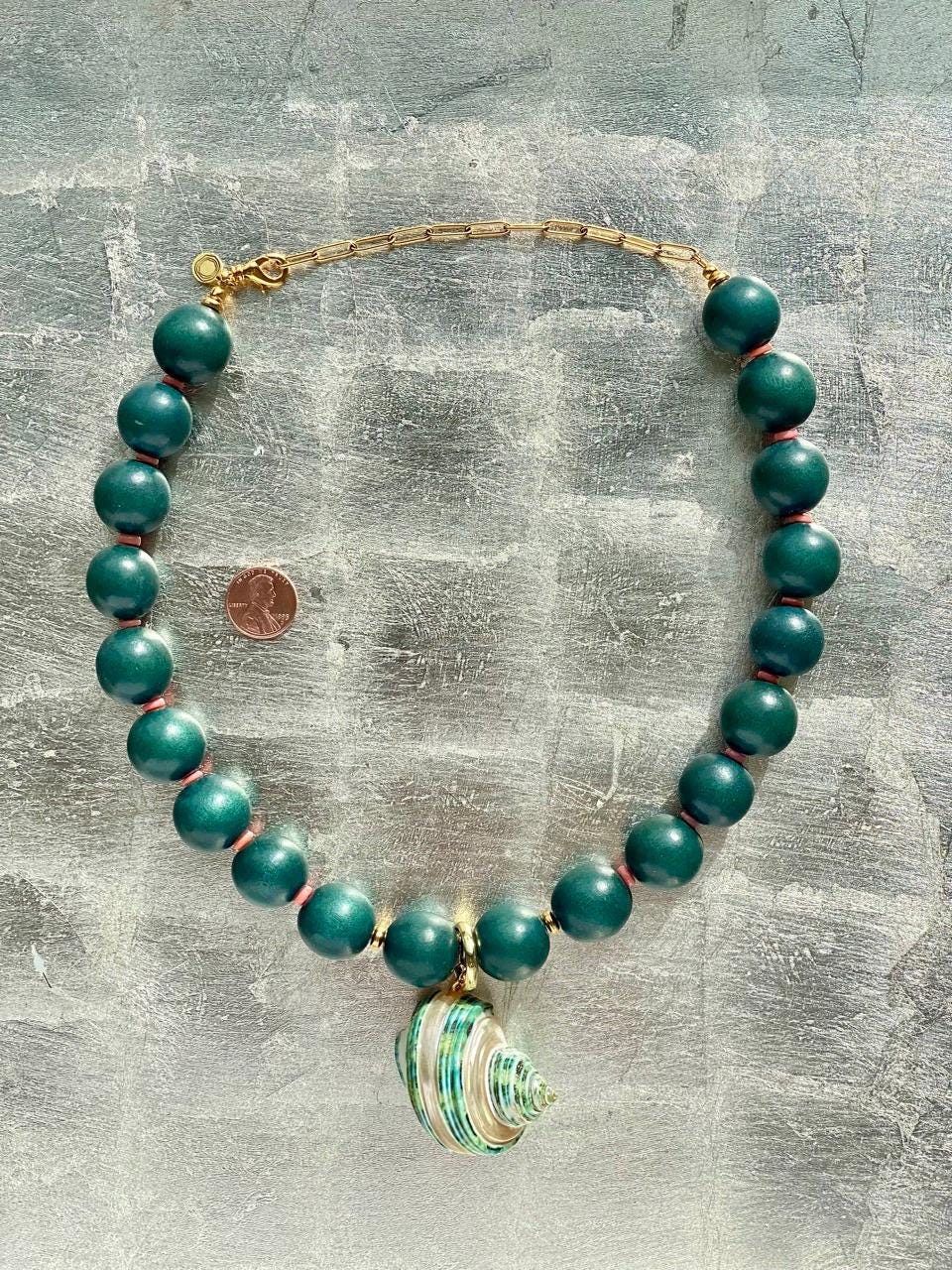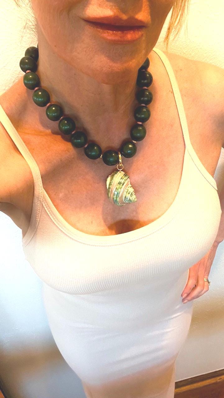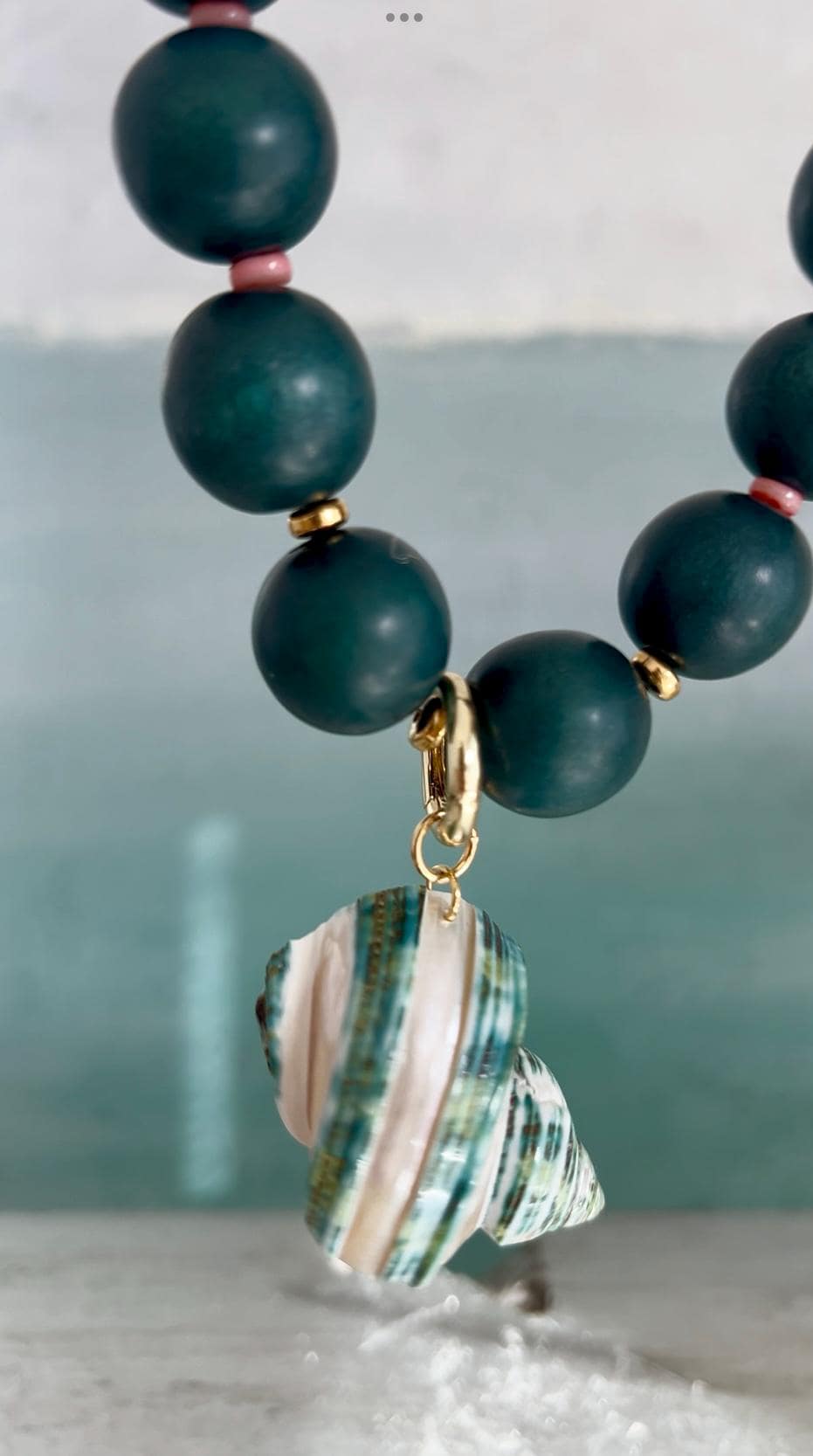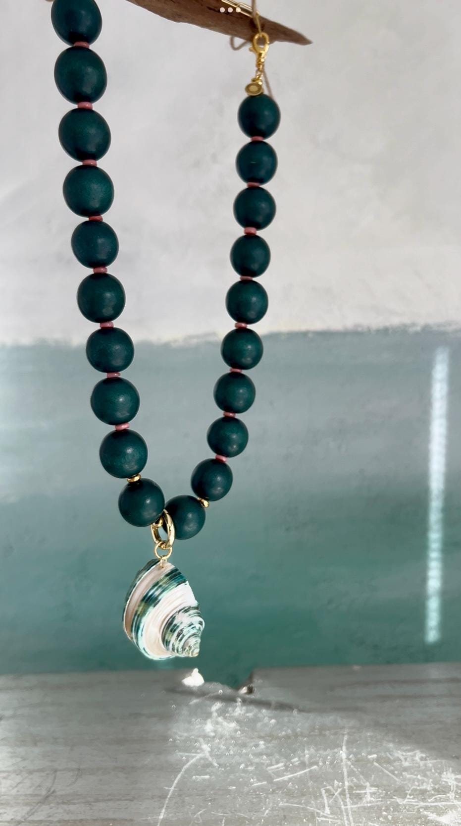 Sophisticated, Summer statement necklace. Tropical green and pink choker necklace with unusual green striped Turbo Shell (aprox. 1.5" tall by 1.75" wide), large green wood beads, bright pink shell heishi spacers and gold plated spacers at the front. 19" -23" with adjustable gold plated lobster clasp and chain. All jewelry is handmade of natural materials, by me, by the beach in California or by the mountains in Colorado or wherever I happen to be traveling. Packaging is compostable or recycled and/or recyclable. Items are shipped in an organic cotton jewelry bag, with a care card, in a gift box with raffia ribbon and wood beads, ready for gifting to yourself or another. Beauette is the manifestation of my belief that beauty should not be reserved for special occasions but found in everyday life. A beautiful little thing can turn the ordinary special. Inspired by my travels around the world from gorgeous islands to awesome mountains to captivating deserts, Beauette helps to preserve that magnificent nature by using natural and sustainable materials.