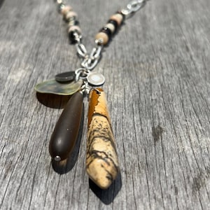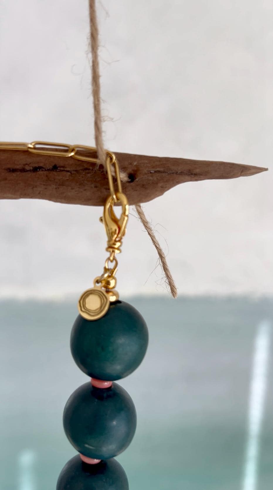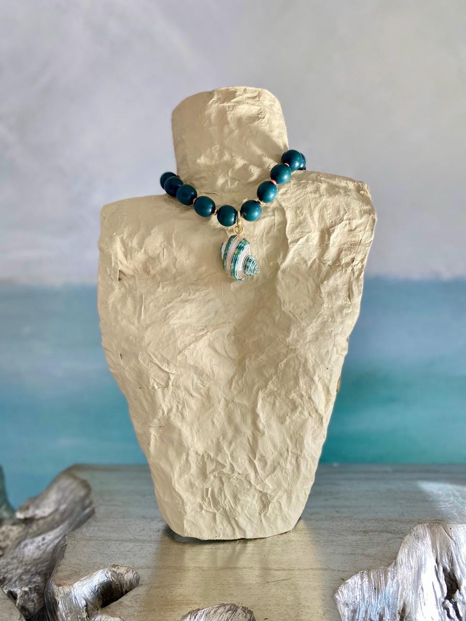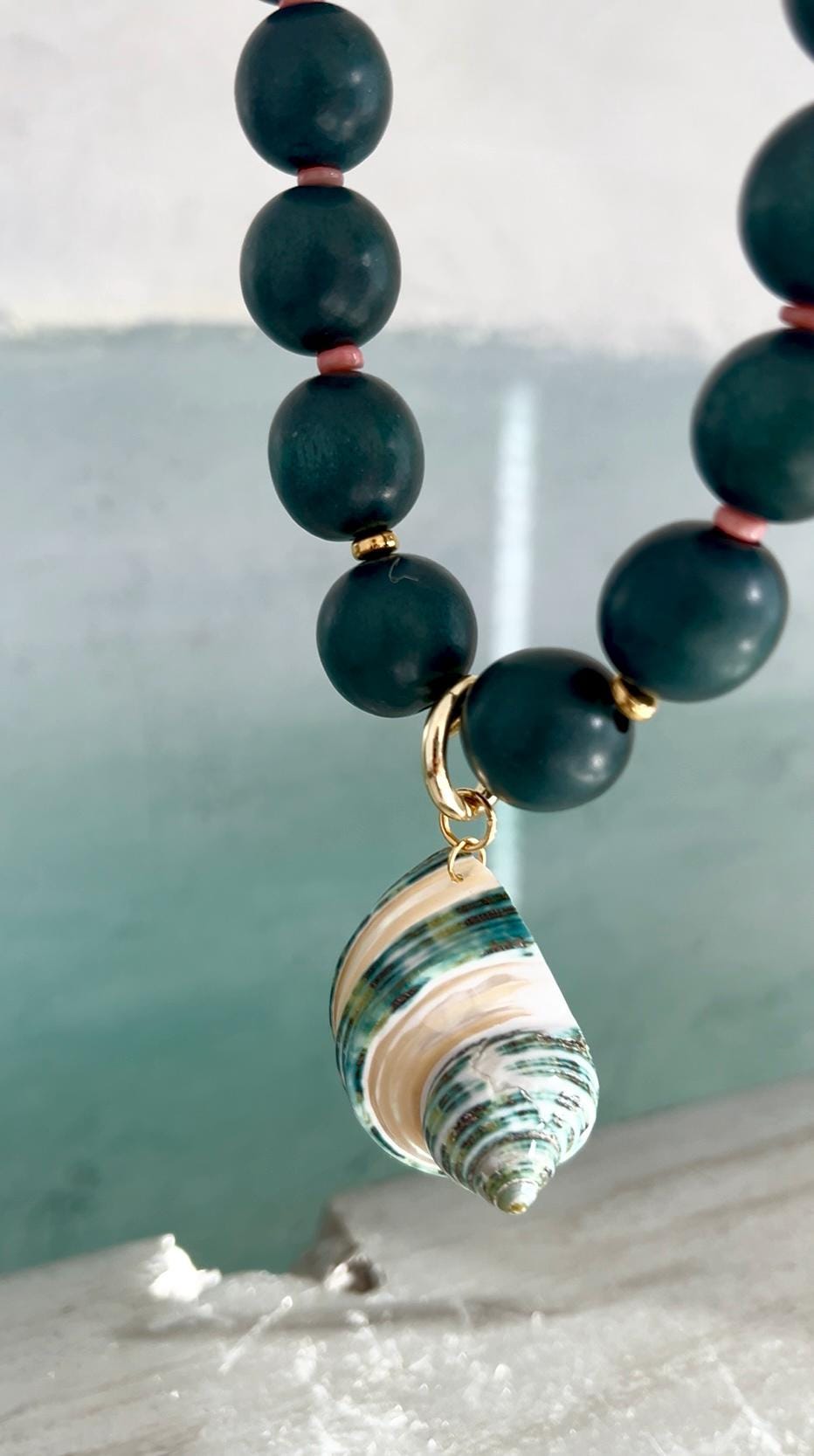 Sophisticated, Summer statement necklace. Tropical green and pink choker necklace with unusual green striped Turbo Shell (aprox. 1.5" tall by 1.75" wide), large green wood beads, bright pink shell heishi spacers and gold plated spacers at the front. 19" -23" with adjustable gold plated lobster clasp and chain. All jewelry is handmade of natural materials, by me, by the beach in California or by the mountains in Colorado or wherever I happen to be traveling. Packaging is compostable or recycled and/or recyclable. Items are shipped in an organic cotton jewelry bag, with a care card, in a gift box with raffia ribbon and wood beads, ready for gifting to yourself or another. Beauette is the manifestation of my belief that beauty should not be reserved for special occasions but found in everyday life. A beautiful little thing can turn the ordinary special. Inspired by my travels around the world from gorgeous islands to awesome mountains to captivating deserts, Beauette helps to preserve that magnificent nature by using natural and sustainable materials.